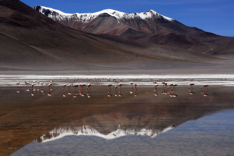 Die Flamingos stolzieren durch die Lagune, als liefen sie auf einem Spiegel. Wenn der Fotograf weit genug in die Hocke geht, bildet das Ufer auf der anderen Seite durch die Perspektive eine Symmetrieachse. Die Tiere bewegen sich, wenn überhaupt, nur langsam, das Bild scheint in einem surrealen Panorama zu verharren. Das haben Sie in einer solch unwirtlichen Landschaft nicht erwartet. Picknick unterwegs bevor Sie dann die Fahrt durch die Chiguana-Wüste fortsetzen und der Route der Vulkane folgen.